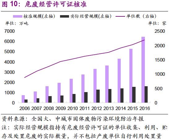 危廢經(jīng)營(yíng)許可規(guī)模的增加速度與需求釋放速度相當(dāng)。值得注意的是,2013-2016年,全國(guó)危廢產(chǎn)量年均復(fù)合增速19%,危廢許可經(jīng)營(yíng)規(guī)模年均復(fù)合增速21%。截止2016年底,總核準(zhǔn)發(fā)放規(guī)模已達(dá)到6471萬(wàn)噸。