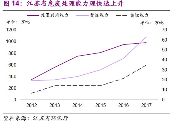 環(huán)保壓力下需求雙層疊加,產(chǎn)能釋放速度有望加快。危廢產(chǎn)業(yè)供需解構(gòu)——需求側(cè):危險(xiǎn)廢物處置需求增加的背后,是我國(guó)工業(yè)規(guī)模和產(chǎn)品產(chǎn)量的增長(zhǎng)。危廢產(chǎn)量與工業(yè)增加值高度相關(guān)(相關(guān)系數(shù)0.91),且具有較強(qiáng)的行業(yè)結(jié)構(gòu)性。同時(shí)行業(yè)隱性需求的釋放對(duì)環(huán)保壓力較為依賴。供給側(cè):面對(duì)需求釋放,危廢許可經(jīng)營(yíng)發(fā)放規(guī)模表現(xiàn)出較大彈性(2013-2016年CAGR達(dá)21%),但實(shí)際經(jīng)營(yíng)規(guī)模增速有限,由此造成產(chǎn)能利用率進(jìn)一步下降(2013-2016年由37%降至25%)。當(dāng)前,“環(huán)保督察”推動(dòng)隱性需求釋放、倒逼產(chǎn)業(yè)治理:“歷史存量+當(dāng)期增量”雙層疊加推動(dòng)“量”的提升,供需不平衡導(dǎo)致區(qū)域“價(jià)”的提升,預(yù)計(jì)未來(lái)2-3年行業(yè)產(chǎn)能釋放速度將加快。