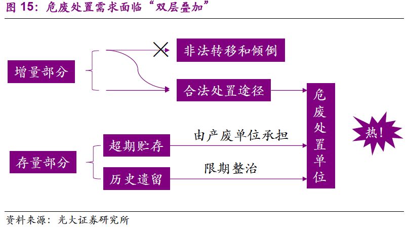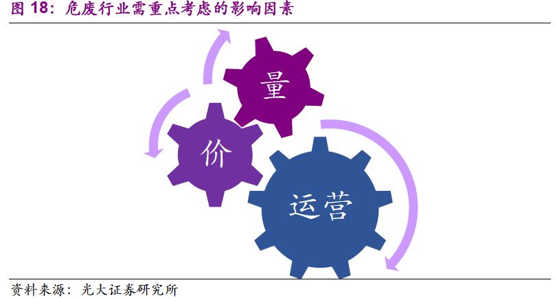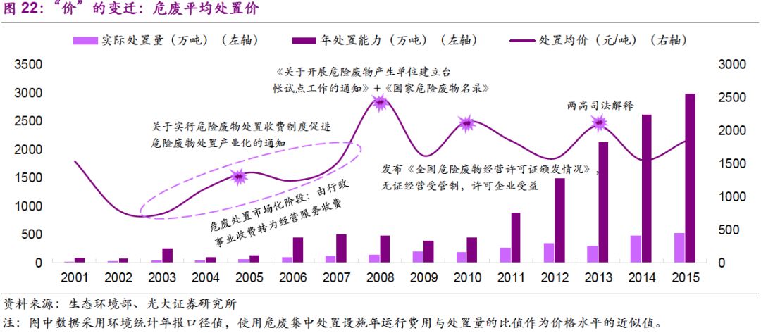 1. “量”的驅(qū)動(dòng)力已經(jīng)由工業(yè)發(fā)展轉(zhuǎn)變?yōu)榄h(huán)保執(zhí)法:環(huán)保壓力下,危廢處置需求“歷史存量+當(dāng)期增量”雙層疊加,產(chǎn)能釋放速度有望加快;“價(jià)”的波動(dòng)也在反映供需的邊際變化,短期上行、長(zhǎng)期回穩(wěn)。