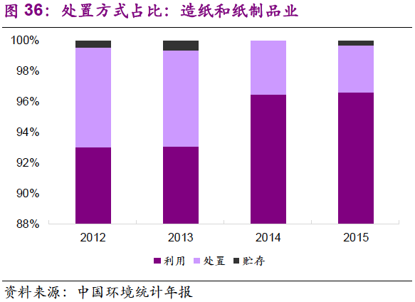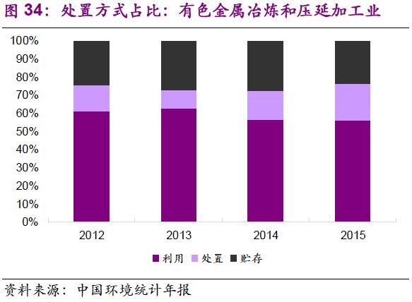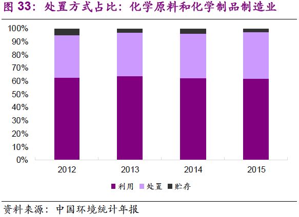 5. 在主要產(chǎn)廢行業(yè)中,危廢的利用和處置占比變化不大?;瘜W(xué)原料和化學(xué)制品制造業(yè):2012-2015年,行業(yè)危廢綜合利用率在62%~64%之間窄幅振動(dòng),處置率為32%~35%;有色金屬冶煉和壓延加工業(yè):2012-2015年,行業(yè)危廢綜合利用率在56%~63%之間窄幅振動(dòng),處置率為11%~20%;非金屬礦采選業(yè):2012-2015年,行業(yè)危廢貯存率小幅下降,由2012年的93%降至2015年的79%,利用率由7%提升至21%,主要是石棉廢物的綜合利用取得進(jìn)展。造紙和紙制品業(yè):行業(yè)危廢綜合利用率較高,且小幅上升,至2015年已達(dá)97%。