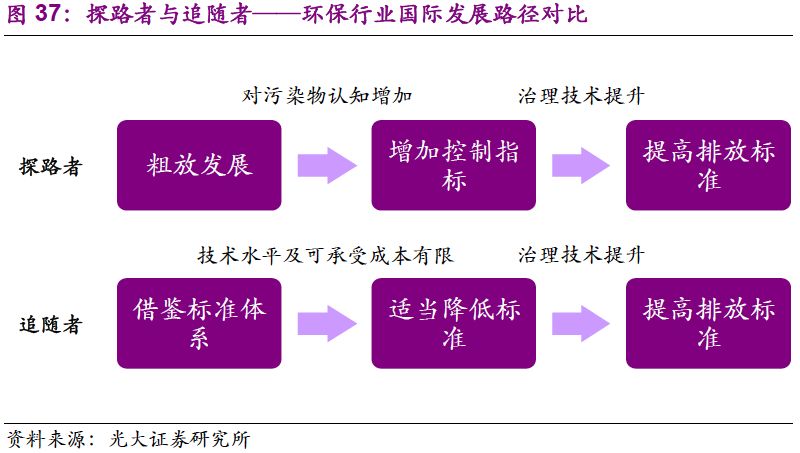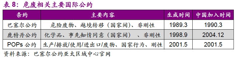 縱觀國(guó)際,我們認(rèn)為中國(guó)危廢行業(yè)在技術(shù)和標(biāo)準(zhǔn)上屬于“追隨者”,具備“早熟”的特點(diǎn)。由于工業(yè)發(fā)展較快,發(fā)達(dá)國(guó)家的環(huán)保意識(shí)率先覺(jué)醒。隨著對(duì)污染物的認(rèn)知提升,行業(yè)標(biāo)準(zhǔn)趨嚴(yán),技術(shù)規(guī)范性逐漸提高。到了20世紀(jì)90年代,發(fā)達(dá)國(guó)家“探路者”的工作已基本完成。發(fā)展中國(guó)家雖與發(fā)達(dá)國(guó)家在工業(yè)及環(huán)保行業(yè)起步具有時(shí)間的滯后性,但在行業(yè)發(fā)展初期可以對(duì)整套標(biāo)準(zhǔn)及技術(shù)規(guī)范進(jìn)行借鑒,從而具備“早熟”的特點(diǎn)。