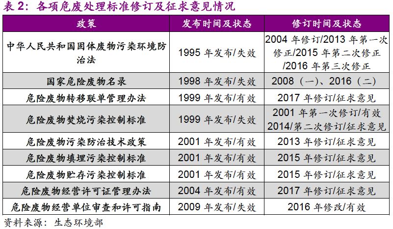 1995年《固廢法》的出臺(tái),標(biāo)志著我國(guó)危廢行業(yè)的起步。《固體廢物污染環(huán)境防治法》首次從法律層面涉及危廢管理,同時(shí)提及經(jīng)營(yíng)許可證、危險(xiǎn)廢物轉(zhuǎn)移聯(lián)單、國(guó)家危險(xiǎn)廢物名錄,而三者落地的時(shí)間分別為2004、1999和1998年。從1995-2002年,我國(guó)基本建立起危廢處理處置從鑒別-處理-排放的標(biāo)準(zhǔn)體系。