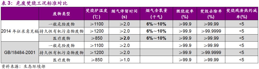 隨著對(duì)危廢焚燒條件掌握成熟,征求意見(jiàn)稿首先對(duì)危廢燃燒工況標(biāo)準(zhǔn)做了提高。相比GB/18484-2001,新增煙氣含氧量(干氣)指標(biāo),醫(yī)療廢物的煙氣停留時(shí)間限值由1 s改為2 s。