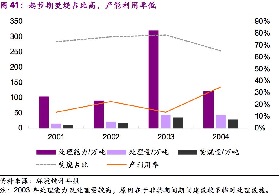 這一時(shí)期,焚燒占比維持在70%左右,產(chǎn)能利用率維持在20%左右。危廢處理以焚燒為主,我們認(rèn)為原因有二:一是第一版《危險(xiǎn)廢物名錄》中危廢種類尚未健全;二是資源化技術(shù)落后,大部分危廢只能通過(guò)焚燒處理。