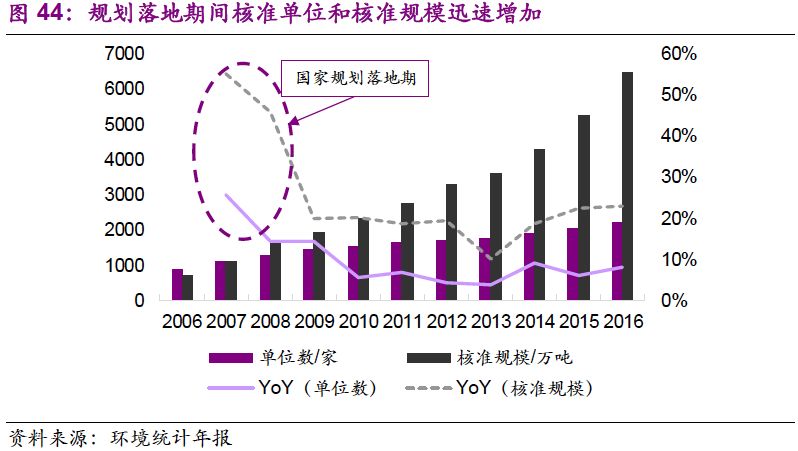 《規(guī)劃》的大規(guī)模實(shí)施,帶來(lái)了危廢行業(yè)的第一次狂飆猛進(jìn)。從年運(yùn)行費(fèi)用看,2004-2008年規(guī)劃實(shí)施期間增速保持在60%-80%之間。從危廢核準(zhǔn)規(guī)模來(lái)看,增速中樞在40%左右。2008年以后,隨著大部分項(xiàng)目建成運(yùn)行,危廢核準(zhǔn)規(guī)模和年運(yùn)行費(fèi)用增速中樞降至20%。