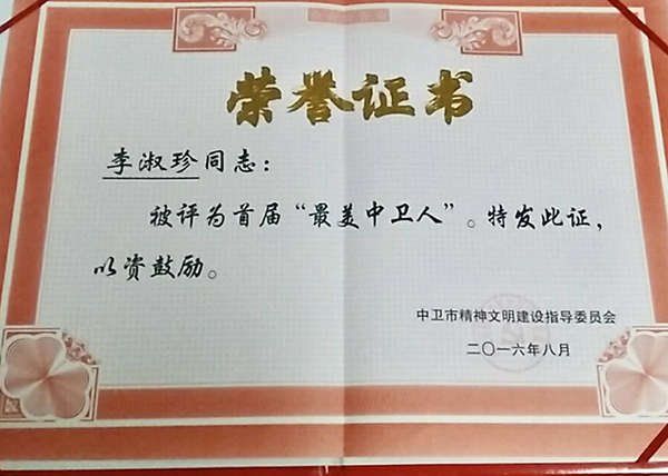 中衛(wèi)市還將環(huán)衛(wèi)工人列入“感動(dòng)中衛(wèi)人物”、“市級(jí)勞模”等評(píng)先選優(yōu)范圍,進(jìn)一步激發(fā)了環(huán)衛(wèi)工的榮譽(yù)感和勞動(dòng)熱情。圖為環(huán)衛(wèi)工人李淑珍取得的“最美中衛(wèi)人”榮譽(yù)證書(shū)。光明網(wǎng)王麗媛/攝