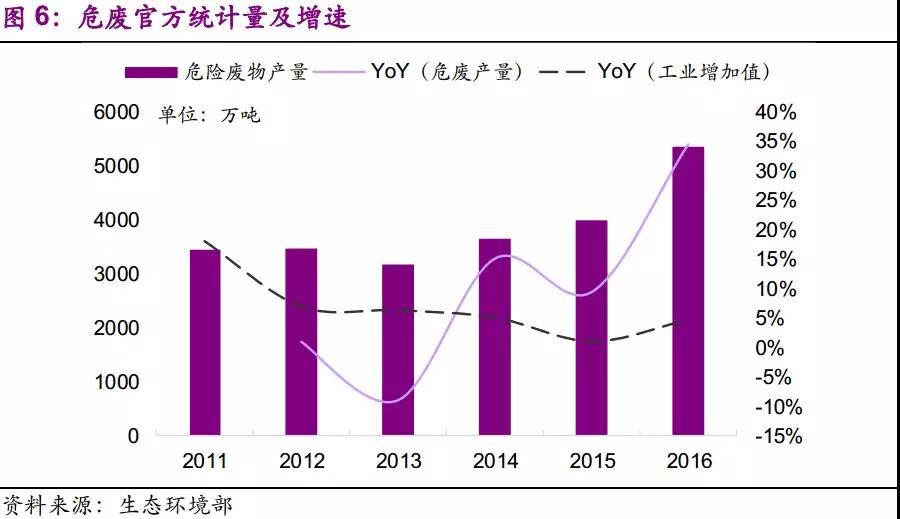 (2)環(huán)保壓力提升,官方統(tǒng)計(jì)量已逐漸彌補(bǔ)先前統(tǒng)計(jì)不足的問題。2013年兩高司法解釋后,官方統(tǒng)計(jì)量增速不斷提高,2016年增速34%,遠(yuǎn)高于同期工業(yè)增加值增速5%??紤]到對(duì)危廢申報(bào)登記制度執(zhí)行情況的核查已納入危險(xiǎn)廢物規(guī)范化管理指標(biāo)體系,我們認(rèn)為應(yīng)重視官方統(tǒng)計(jì)量的意義:反映環(huán)保力量所觸及之處的顯性需求。隨著環(huán)保執(zhí)法逐漸深化,隱性需求不斷轉(zhuǎn)化為顯性需求,官方統(tǒng)計(jì)量將更好地體現(xiàn)危廢的產(chǎn)生量,并接近真實(shí)產(chǎn)生量。