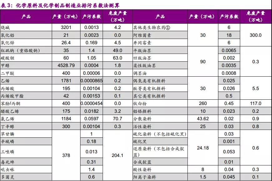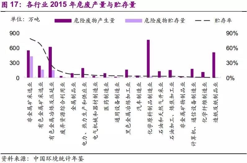 ◆增量部分:自上而下,從工業(yè)增加值的角度:產(chǎn)廢強(qiáng)度不變的情況下,危廢每年新增1.1億噸;若考慮到工藝進(jìn)步引起的危廢產(chǎn)生強(qiáng)度下降,在樂觀、中觀、悲觀三種預(yù)期下,2017年實(shí)際工業(yè)危廢產(chǎn)量分別為6706、7546和8666萬噸。自下而上,從產(chǎn)污系數(shù)的角度:我們根據(jù)現(xiàn)有最新數(shù)據(jù)及不完全統(tǒng)計(jì), 2016年,化學(xué)原料和化學(xué)制品制造業(yè)和有色金屬冶煉和壓延加工業(yè)分別為1141.6和1082.2萬噸。2015年,兩個(gè)行業(yè)危廢產(chǎn)量占總產(chǎn)量比例為34.8%,假設(shè)其比例變化不大,則全國危廢總產(chǎn)量為6390萬噸。