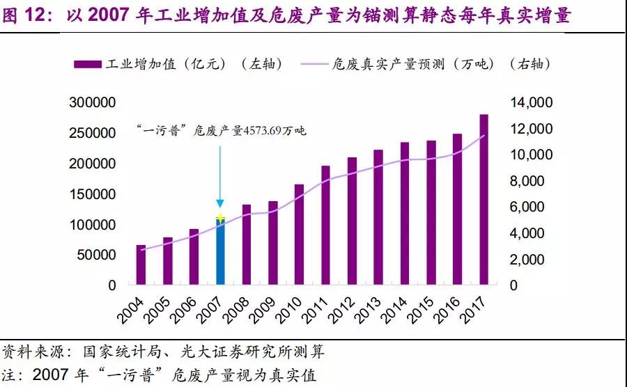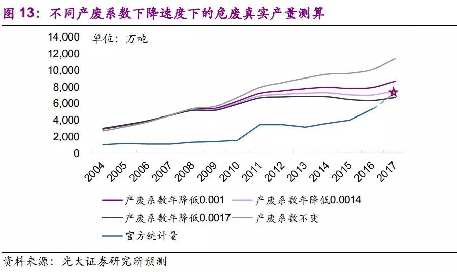 2. 針對(duì)增量市場(chǎng),創(chuàng)新性地提出雙角度危廢產(chǎn)量預(yù)測(cè)模型:1)自上而下——“工業(yè)增加值”角度;2)自下而上——“產(chǎn)污系數(shù)”角度,且兩者預(yù)測(cè)結(jié)果得到了互相驗(yàn)證??紤]到技術(shù)進(jìn)步,將產(chǎn)廢強(qiáng)度(單位工業(yè)增加值危廢產(chǎn)量)下降分為樂觀、中觀和悲觀三種情景進(jìn)行討論。通過對(duì)“污染源普查”和“危廢申報(bào)登記”的制度溯源,首次賦予官方統(tǒng)計(jì)量新的意義,而不是對(duì)其進(jìn)行一味地否定。我們認(rèn)為,環(huán)保執(zhí)法趨嚴(yán)背景下,2018年大概率延續(xù)高增速,官方統(tǒng)計(jì)量有望逼近甚至進(jìn)入預(yù)測(cè)區(qū)間。