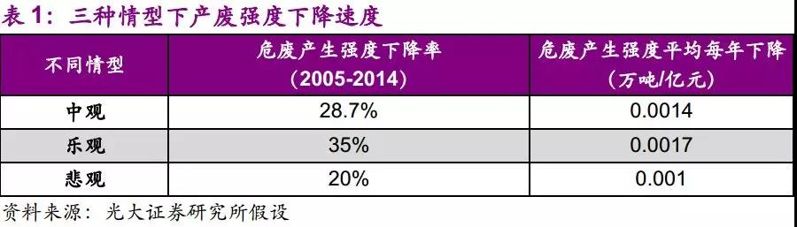 事實(shí)上,隨著技術(shù)和工藝進(jìn)步和工業(yè)結(jié)構(gòu)變化,單位工業(yè)增加值固體廢物產(chǎn)生強(qiáng)度呈逐年下降趨勢(shì)。我們分為樂觀、中觀、悲觀三種假設(shè)預(yù)期,對(duì)危廢產(chǎn)生強(qiáng)度下降速度對(duì)危廢產(chǎn)量的影響進(jìn)行預(yù)測(cè):假設(shè)中觀情況下,危廢產(chǎn)生強(qiáng)度跟隨固廢產(chǎn)生強(qiáng)度,即2014年比2005年下降28.7%。