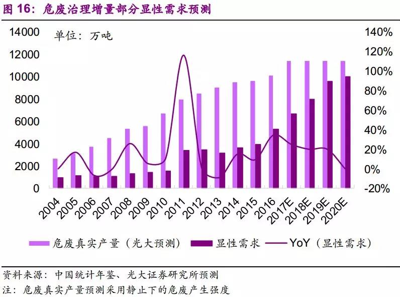 相比2016年危廢官方統(tǒng)計(jì)量增速34%,我們預(yù)測(cè)2017-2019年增速為30%、20%、20%,并于2019年達(dá)到峰值。1)在環(huán)保督察“回頭看”態(tài)勢(shì)不變,“清廢2018”等行動(dòng)直接針對(duì)固廢,加上《“十三五”全國危險(xiǎn)廢物規(guī)范化管理督查考核工作方案》的執(zhí)行,2017年官方統(tǒng)計(jì)量增速不會(huì)低于30%。2)隨著工業(yè)固廢排污許可制度的落地,顯性需求(即官方統(tǒng)計(jì)量)將逼近真實(shí)產(chǎn)量??紤]到實(shí)際操作,留出一部分差距。2017-2019年將會(huì)是危廢治理需求集中暴露時(shí)期。