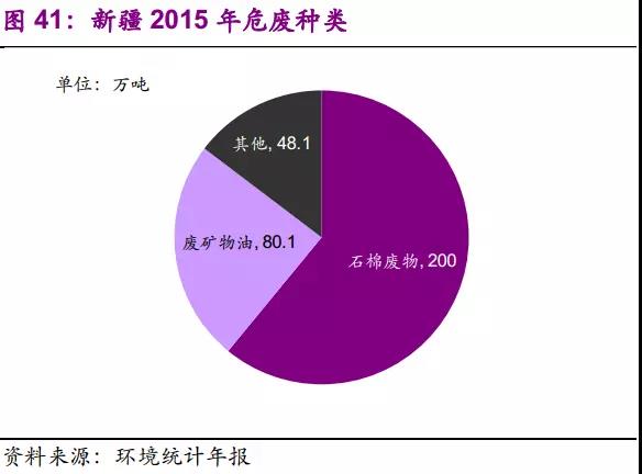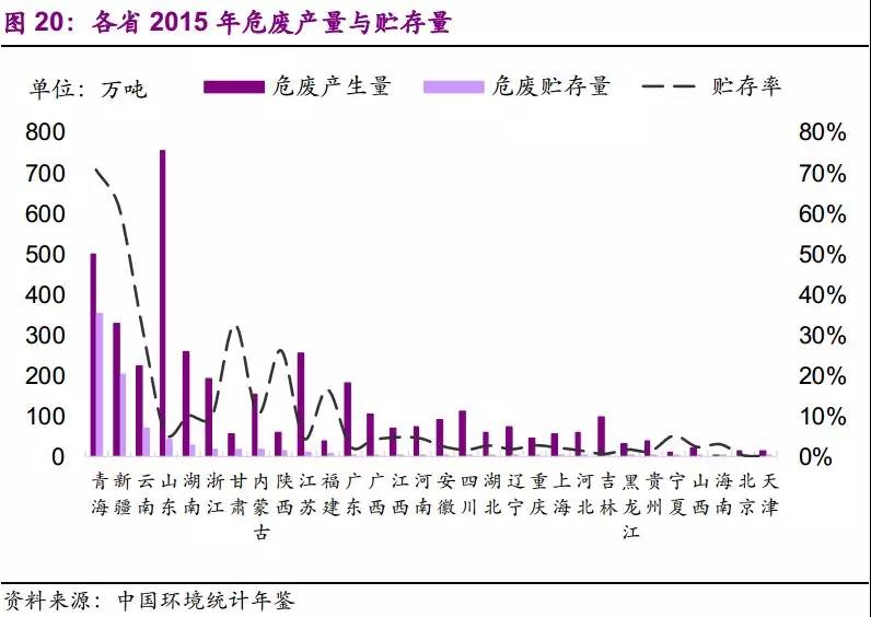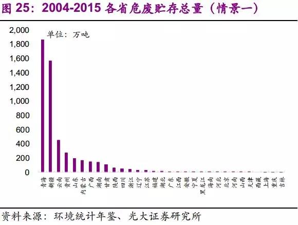 ◆存量部分:自上而下,歷史累積、自然消減和官方統(tǒng)計(jì)量差別三因素模型:假設(shè)年消減系數(shù)γ為0.7、0.8、0.9,則2004-2015年累計(jì)貯存總量分別為6847.9、13584.4、27201.3萬噸。應(yīng)關(guān)注的省份:青海、新疆、云南;應(yīng)關(guān)注的行業(yè):非金屬礦采選業(yè)、有色金屬礦采選業(yè)、有色金屬冶煉及壓延加工業(yè);應(yīng)關(guān)注的危廢種類:石棉廢物、無機(jī)氰化物、有色金屬冶煉廢物等。自下而上,環(huán)保督察角度:危廢存量在“環(huán)保督察”中已大量暴露:在新疆、青海、云南等地,發(fā)現(xiàn)數(shù)百萬噸的石棉、冶煉廢渣以及油泥,驗(yàn)證了我們前文提到的需關(guān)注行業(yè)和省份。