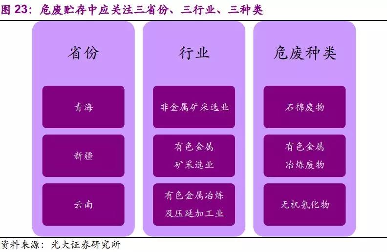 綜上,危廢貯存量應(yīng)關(guān)注的省份:青海、新疆、云南;應(yīng)關(guān)注的行業(yè):非金屬礦采選業(yè)、有色金屬礦采選業(yè)、有色金屬冶煉及壓延加工業(yè);應(yīng)關(guān)注的危廢種類:石棉廢物、無機(jī)氰化物、有色金屬冶煉廢物等。