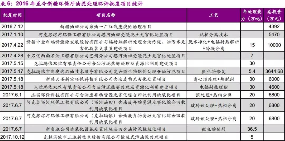 存量油泥的的治理蘊(yùn)藏巨大機(jī)會(huì)。相比其他危險(xiǎn)廢物,油泥的利用價(jià)值相對(duì)較高。從新疆環(huán)保廳環(huán)評(píng)批復(fù)情況來看,新疆油泥處理正迎來一波投資熱潮。僅對(duì)2016年至今環(huán)評(píng)批復(fù)項(xiàng)目進(jìn)行統(tǒng)計(jì),共有31個(gè)第三方油泥治理項(xiàng)目,總投資超過19億元,全部建成后將形成621萬噸/年的油泥處理能力。
