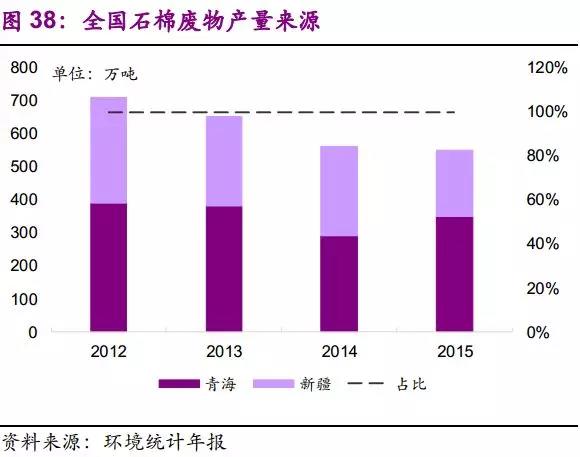 在新疆、青海兩省危廢總產(chǎn)量中,石棉占據(jù)了絕對(duì)優(yōu)勢(shì)地位。其中青海危廢產(chǎn)量中,石棉廢物2015年產(chǎn)量348.5萬噸,占比近70%。新疆危廢總產(chǎn)量中,石棉廢物2015年產(chǎn)量200萬噸,占比近61%。