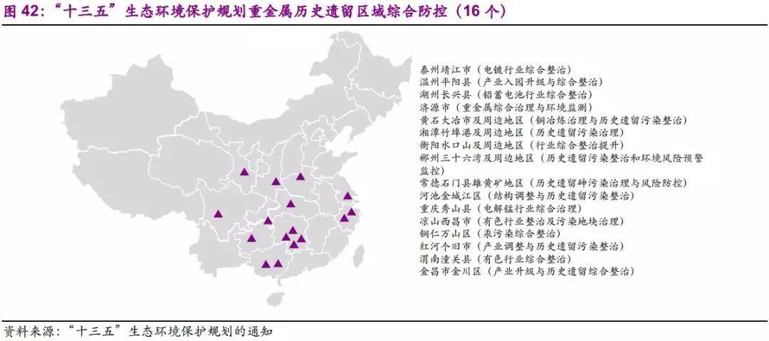 “十三五”期間,我國繼續(xù)加強(qiáng)對(duì)重金屬區(qū)域綜合防控和流域綜合整治。其中湖州長(zhǎng)興縣(鉛蓄電池行業(yè)綜合整治)、湘潭竹埠港及周邊地區(qū)(歷史遺留污染治理)、衡陽水口山及周邊地區(qū)(行業(yè)綜合整治提升)、紅河個(gè)舊市(產(chǎn)業(yè)調(diào)整與歷史遺留污染整治)等歷史遺留問題位列其中。