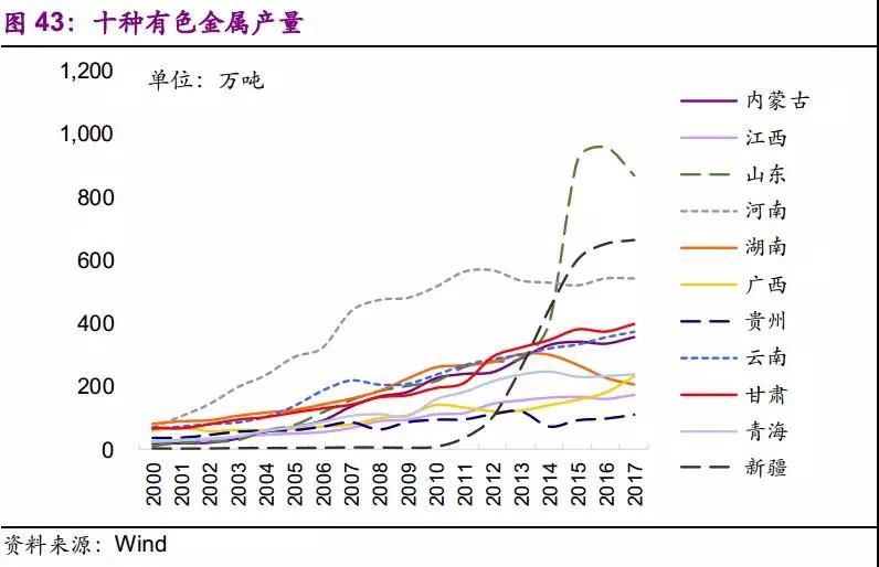 從十種有色金屬產(chǎn)量來看,有色金屬產(chǎn)地與有色金屬礦產(chǎn)地出現(xiàn)一定偏差。如近幾年有色金屬產(chǎn)量快速上升的新疆、山東,并非有色金屬儲(chǔ)量大省。原因可能在于電價(jià)優(yōu)勢(shì)引發(fā)電解鋁產(chǎn)能快速擴(kuò)張。而西南地區(qū)有色金屬大省,如貴州、云南、湖南等省份,有色金屬產(chǎn)量增加相對(duì)較為緩慢。