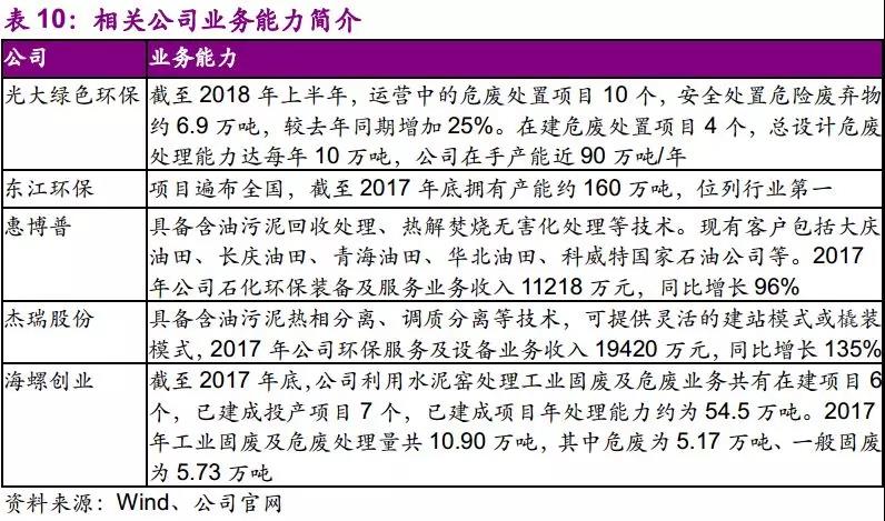我們認(rèn)為行業(yè)當(dāng)前面臨存量和增量雙層疊加,具備高景氣度。根據(jù)我們預(yù)測(cè),2017-2019年將會(huì)是危廢治理顯性需求集中暴露時(shí)期,且存量部分已進(jìn)入整治方案,未來治理加速。針對(duì)增量暴露并逐步接近真實(shí)產(chǎn)量下的機(jī)會(huì),具備規(guī)模優(yōu)勢(shì)和優(yōu)異運(yùn)營(yíng)能力的公司將有望在新一輪跑馬圈地中脫穎而出,建議關(guān)注:光大綠色環(huán)保(H)、東江環(huán)保(A+H);針對(duì)存量整治下的機(jī)會(huì),建議關(guān)注油泥治理:惠博普、杰瑞股份;水泥窯協(xié)同氰化物治理:海螺創(chuàng)業(yè)(H)。