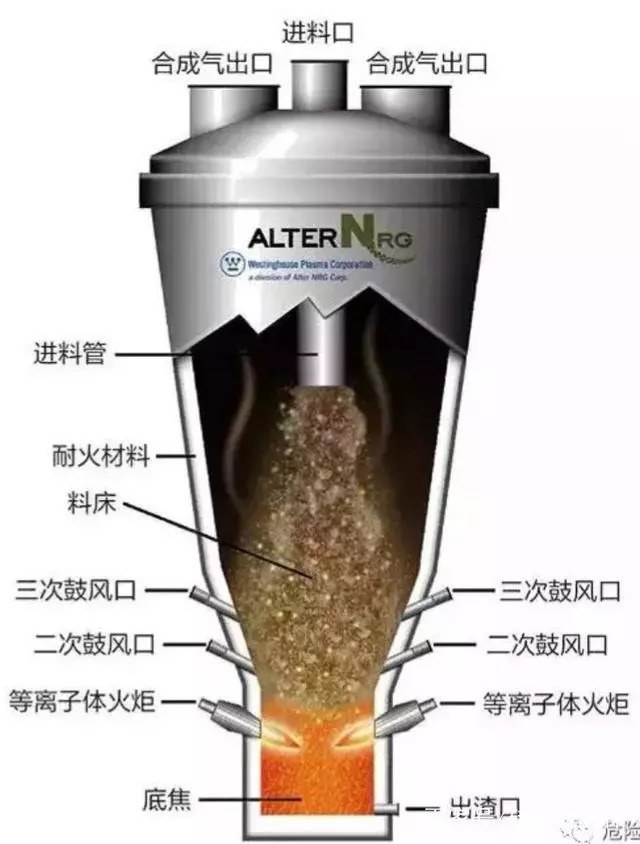 關(guān)鍵詞三,極速。采用熱解爐的等離子體處理技術(shù),混勻的危廢物料勻速進入,與高溫?zé)峤饪扇細(xì)怏w充分換熱干燥,等離子體高溫反應(yīng)區(qū)發(fā)生劇烈熱解反應(yīng),極短的時間內(nèi)物料的有機物成分分解為CH4、H2、CO、HCl、H2S、HF等,而無機成分進入熔融槽內(nèi)形成玻璃化熔渣(微量汞、鋅、鉛、銅、鎘、鉻、砷等易蒸發(fā)重金屬元素被可燃?xì)怏w帶走,難蒸發(fā)重金屬元素融入玻璃體熔渣中。),不存在翻勻、攪拌、湍流等工藝,因此,熱解反應(yīng)時間非常短,反應(yīng)非常徹底。
