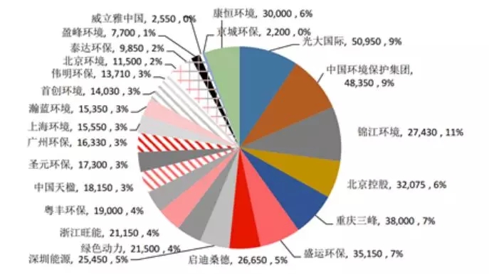 中國垃圾焚燒市場占率(按2016年底在手項目規(guī)模統(tǒng)計)