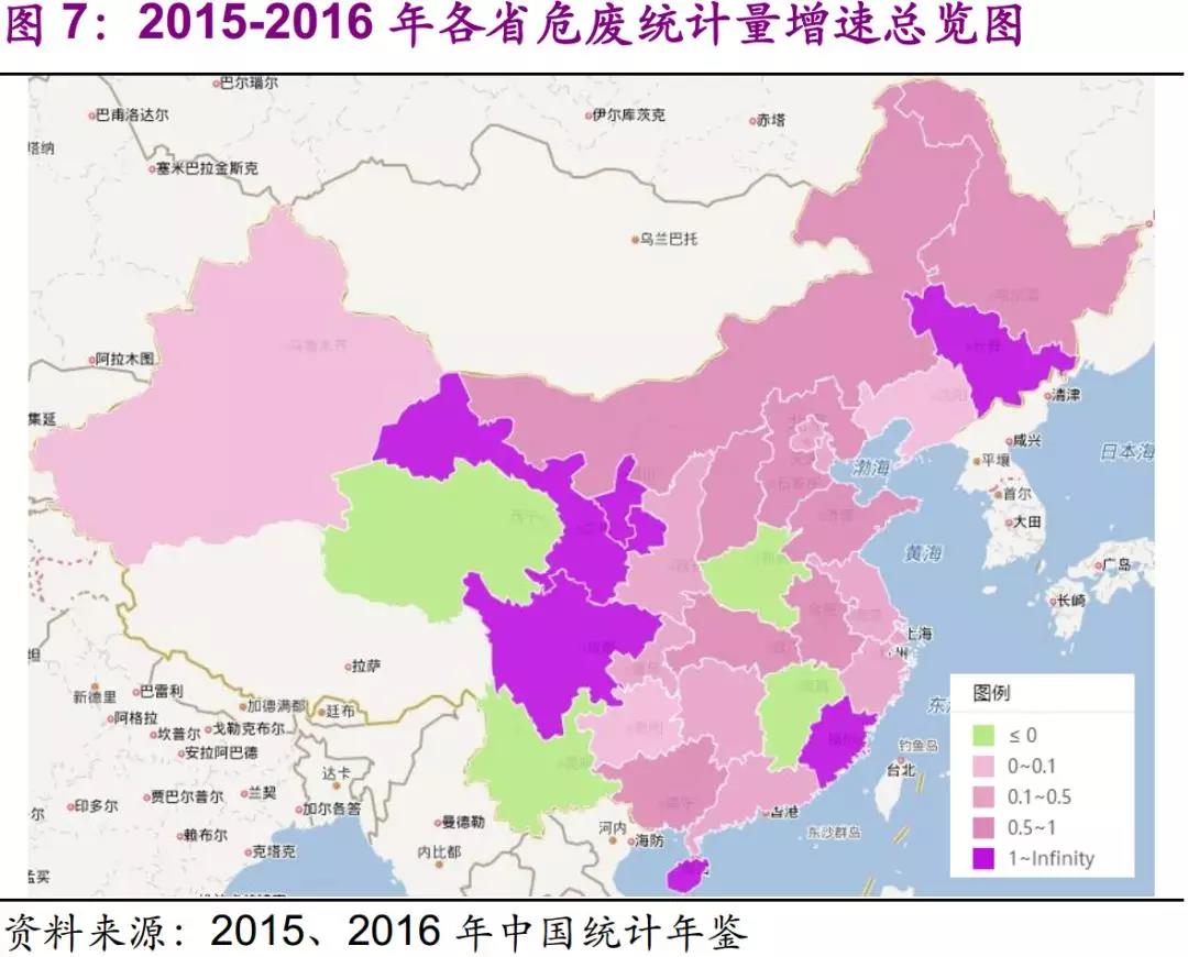 2016年危廢產(chǎn)生統(tǒng)計(jì)量增速較快、覆蓋越來(lái)越全面。2015-2016年,全國(guó)危廢產(chǎn)量由3976.11萬(wàn)噸上升至5347.3萬(wàn)噸,增速達(dá)35%。高增速一方面包含各行業(yè)產(chǎn)廢自然增速,另一方面也涵蓋了環(huán)保壓力下先前統(tǒng)計(jì)缺失的補(bǔ)足。