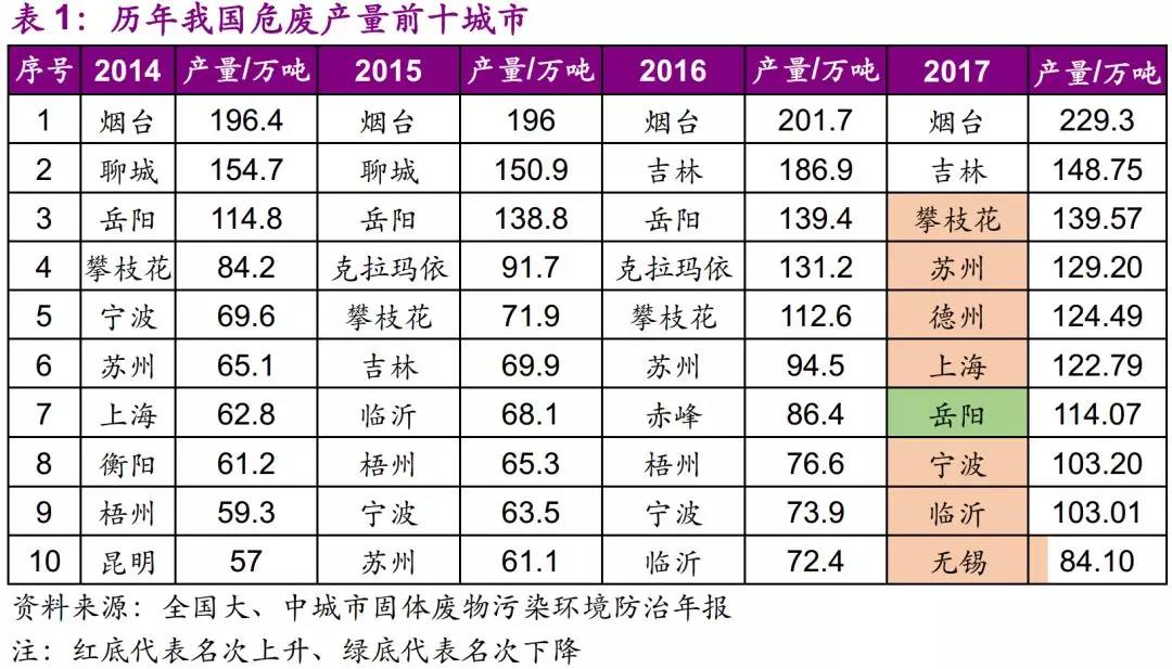 從全國(guó)危廢產(chǎn)量前十大城市來(lái)看,長(zhǎng)三角及山東重點(diǎn)工業(yè)城市在列。其中蘇州、德州、上海、寧波、臨沂、無(wú)錫等城市位次相比上年均有上升。相比之下,赤峰、岳陽(yáng)、梧州等城市位次下降。危廢產(chǎn)量是相關(guān)工業(yè)發(fā)展的直接產(chǎn)物,而位次的變化是相關(guān)地區(qū)工業(yè)發(fā)展與環(huán)保執(zhí)法壓力的綜合體現(xiàn)。