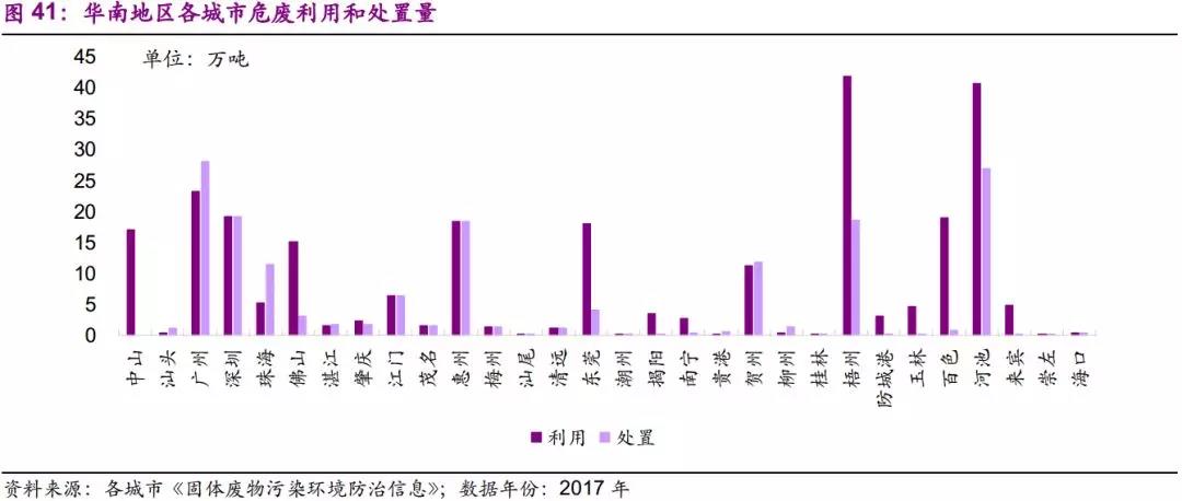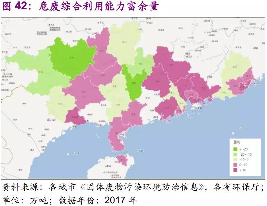 廣東省利用能力嚴(yán)重過(guò)剩,處置能力缺乏;廣西城市間差別較大??赡茉蛟谟谕ㄐ旁O(shè)備、計(jì)算機(jī)及其他電子設(shè)備制造業(yè)所產(chǎn)生的危廢利用價(jià)值較高,資源化產(chǎn)能自發(fā)建造較多,而無(wú)害化產(chǎn)能建設(shè)相對(duì)滯后。而廣西多數(shù)城市危廢種類(lèi)較為單一,產(chǎn)廢量巨大,而工業(yè)總產(chǎn)值卻不高。城市間產(chǎn)能的差別可能與具體冶煉金屬種類(lèi)有關(guān)。