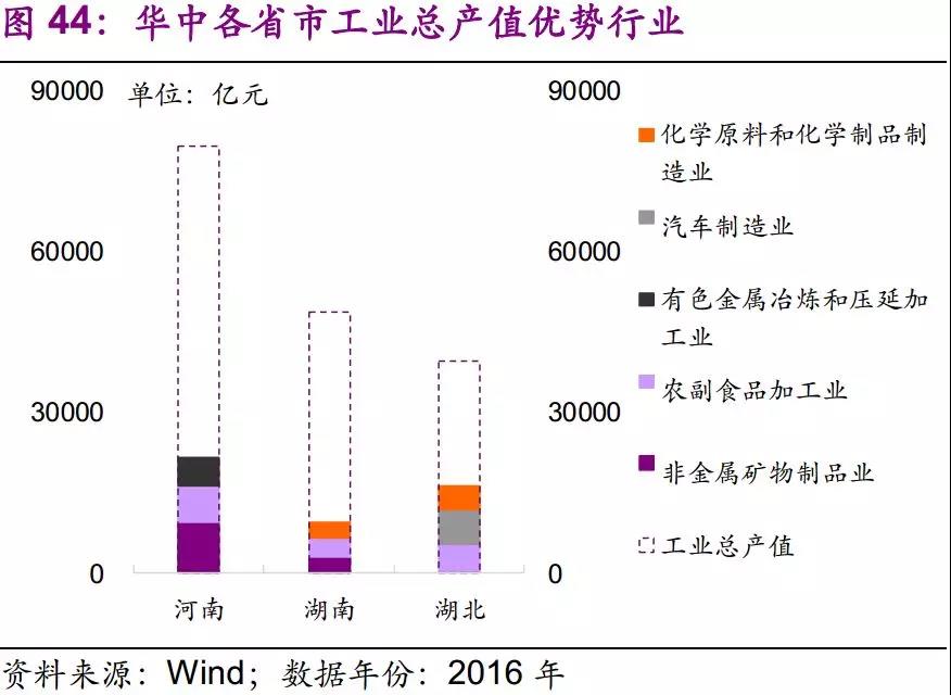從全行業(yè)來(lái)看,河南、湖南、湖北優(yōu)勢(shì)產(chǎn)業(yè)分別為非金屬礦物制品業(yè)、農(nóng)副食品加工業(yè)和汽車(chē)制造業(yè)。