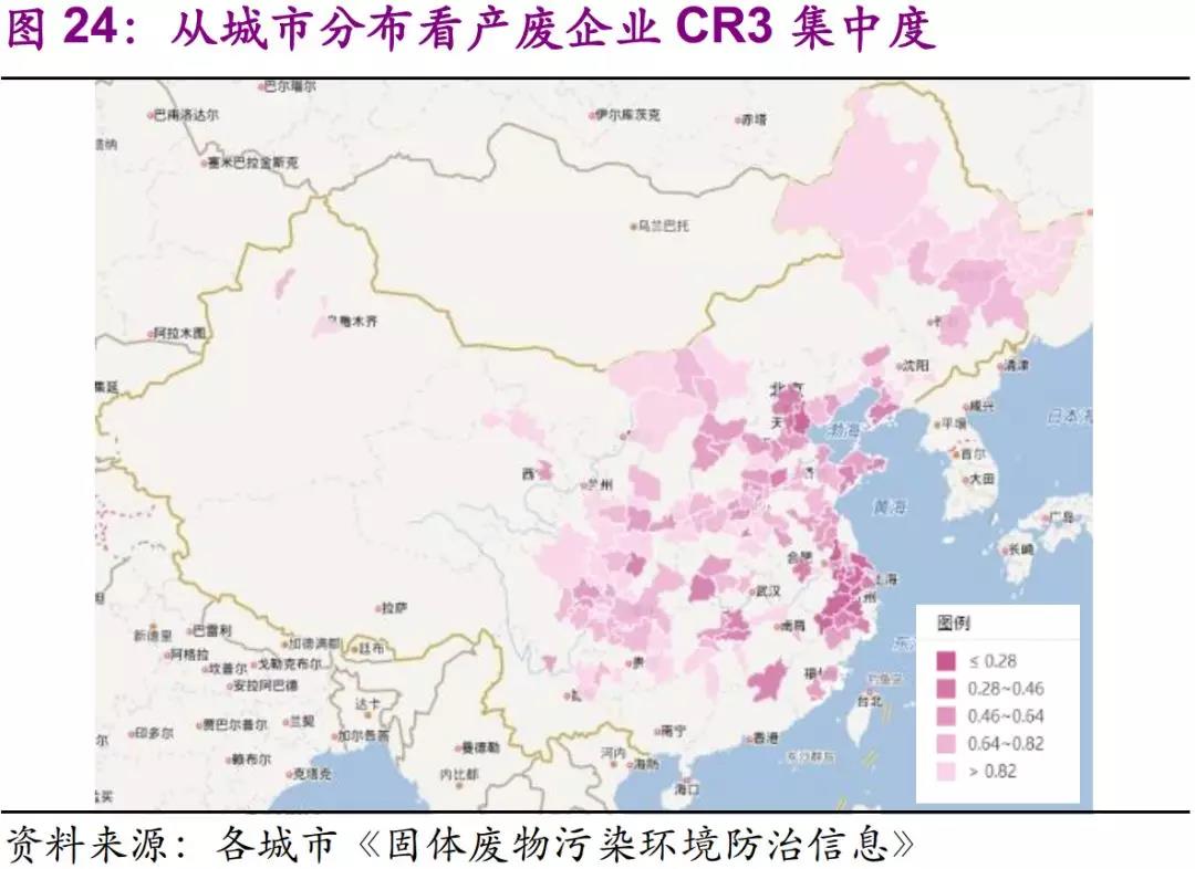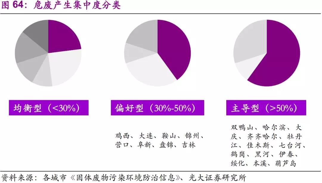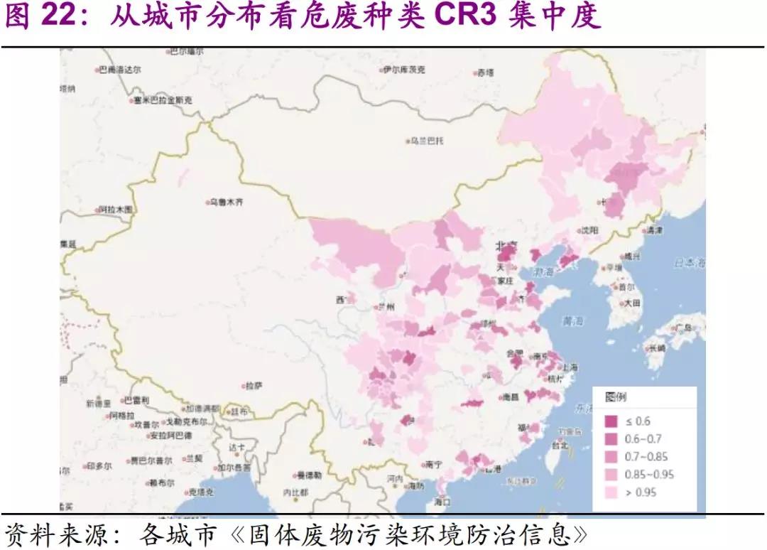 集中度上看,不管是危廢種類(lèi)還是產(chǎn)廢企業(yè),西部、東北地區(qū)明顯大于東部沿海。