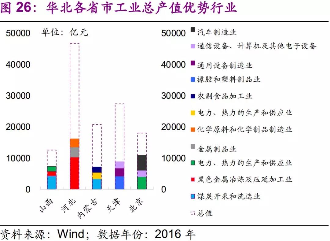 1)京津冀地區(qū)。大氣治理壓力下,重污染企業(yè)限產(chǎn)、停產(chǎn)較多,同時(shí)高污染重工業(yè)逐步外遷。2016年工業(yè)總產(chǎn)值中,北京市和天津市優(yōu)勢(shì)產(chǎn)業(yè)分別為汽車(chē)制造業(yè)和橡膠和塑料制品業(yè)。
