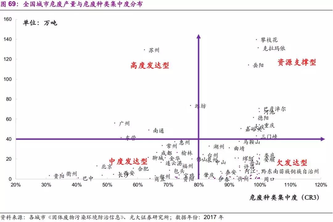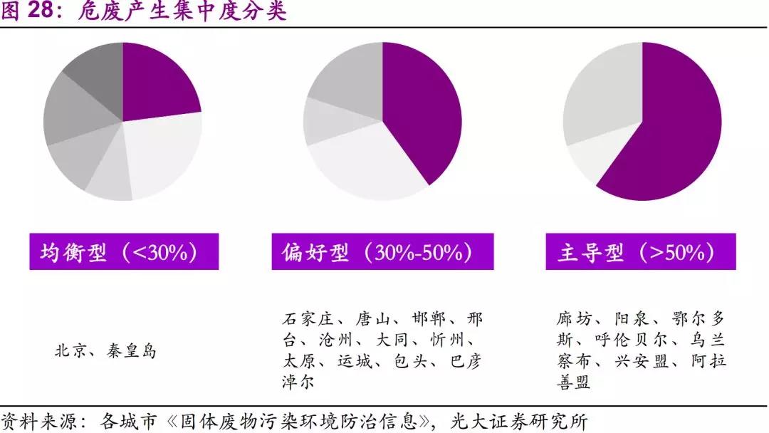 從2017年各市危廢增速來(lái)看,東部沿海地區(qū)延續(xù)高景氣度。從危廢種類(lèi)和產(chǎn)廢企業(yè)集中度來(lái)看,東部地區(qū)種類(lèi)更復(fù)雜,處理工藝要求更高。從城市分類(lèi)來(lái)看,均衡型城市處置需求最為復(fù)雜。