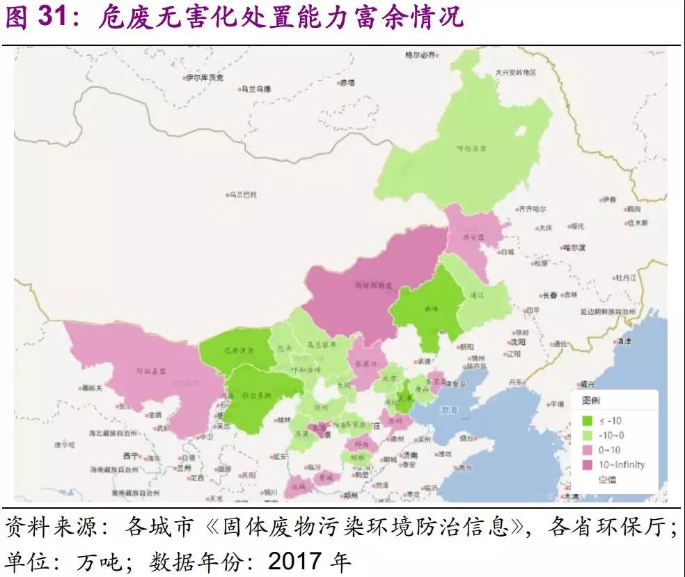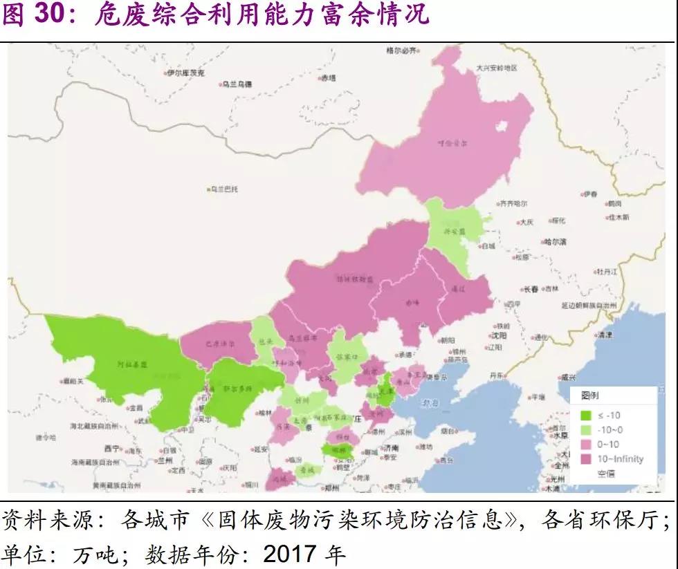 將各城市危廢利用、處置量與相應(yīng)資質(zhì)對(duì)比,可以得到相應(yīng)地區(qū)利用和處理能力的短缺和富余情況。以?xún)?nèi)蒙古為例,可以看到利用能力相對(duì)充足,處置能力則相對(duì)短缺。如赤峰市,經(jīng)我們測(cè)算,2017年利用能力富余51萬(wàn)噸,處置能力則短缺26萬(wàn)噸。