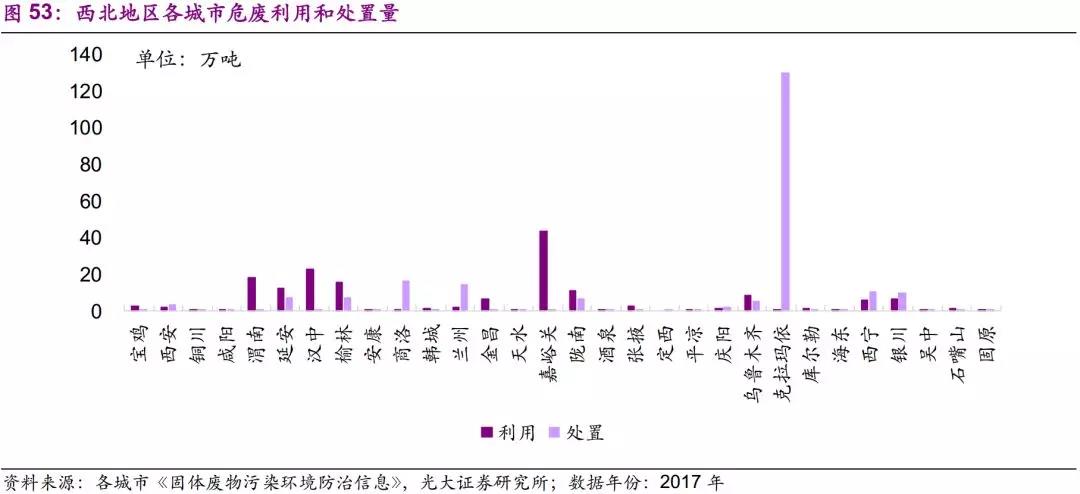 根據(jù)可獲得的城市情況,由于主導(dǎo)型城市產(chǎn)業(yè)結(jié)構(gòu)和危廢種類(lèi)較為單一,因此城市中處置和利用相差懸殊。渭南、嘉峪關(guān)、韓城、漢中等城市基本以利用為主,而克拉瑪依、商洛、蘭州則以處置為主。
