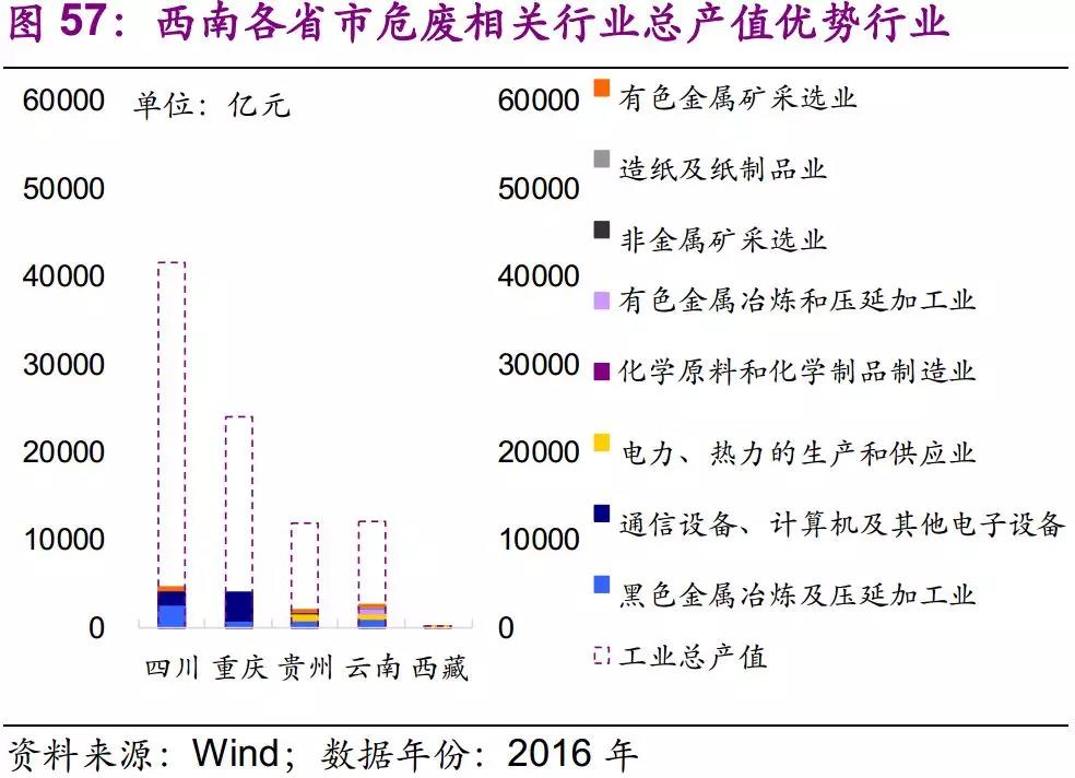 因此,我們認(rèn)為西南地區(qū)應(yīng)重點(diǎn)關(guān)注通信設(shè)備、計(jì)算機(jī)及其他電子設(shè)備制造業(yè)及黑色金屬冶煉及壓延加工業(yè)所產(chǎn)生的危廢,如含銅廢物、廢酸等。此外,貴州、云南作為有色金屬大省,工業(yè)總產(chǎn)值不高,但相關(guān)產(chǎn)業(yè)發(fā)達(dá),也需要重點(diǎn)關(guān)注。