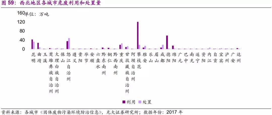 從相關(guān)資質(zhì)許可來(lái)看,西南地區(qū)處置產(chǎn)能較為缺乏,利用產(chǎn)能則具有東南多、西北少的特點(diǎn)。這與西北地區(qū)為少數(shù)民族自治區(qū),同時(shí)較為偏遠(yuǎn)有關(guān)。據(jù)我們了解,四川、云南等地企業(yè)自行處理較為普遍。根據(jù)《云南省危險(xiǎn)廢物利用處置規(guī)劃(2016年-2020年)》,2014年云南省自行利用處置有色金屬冶煉廢物156萬(wàn)噸,委托利用處置29噸。2017年,怒江州自行利用處置和委托利用處置量分別為84和4.6萬(wàn)噸。而《四川省危險(xiǎn)廢物集中處置設(shè)施建設(shè)規(guī)劃(2017-2022)》顯示,全省工業(yè)危險(xiǎn)廢物企業(yè)自行處置利用率約 85%,委托集中處置利用率約12%。因此,核準(zhǔn)產(chǎn)能的缺乏并不代表處理產(chǎn)能的缺乏。