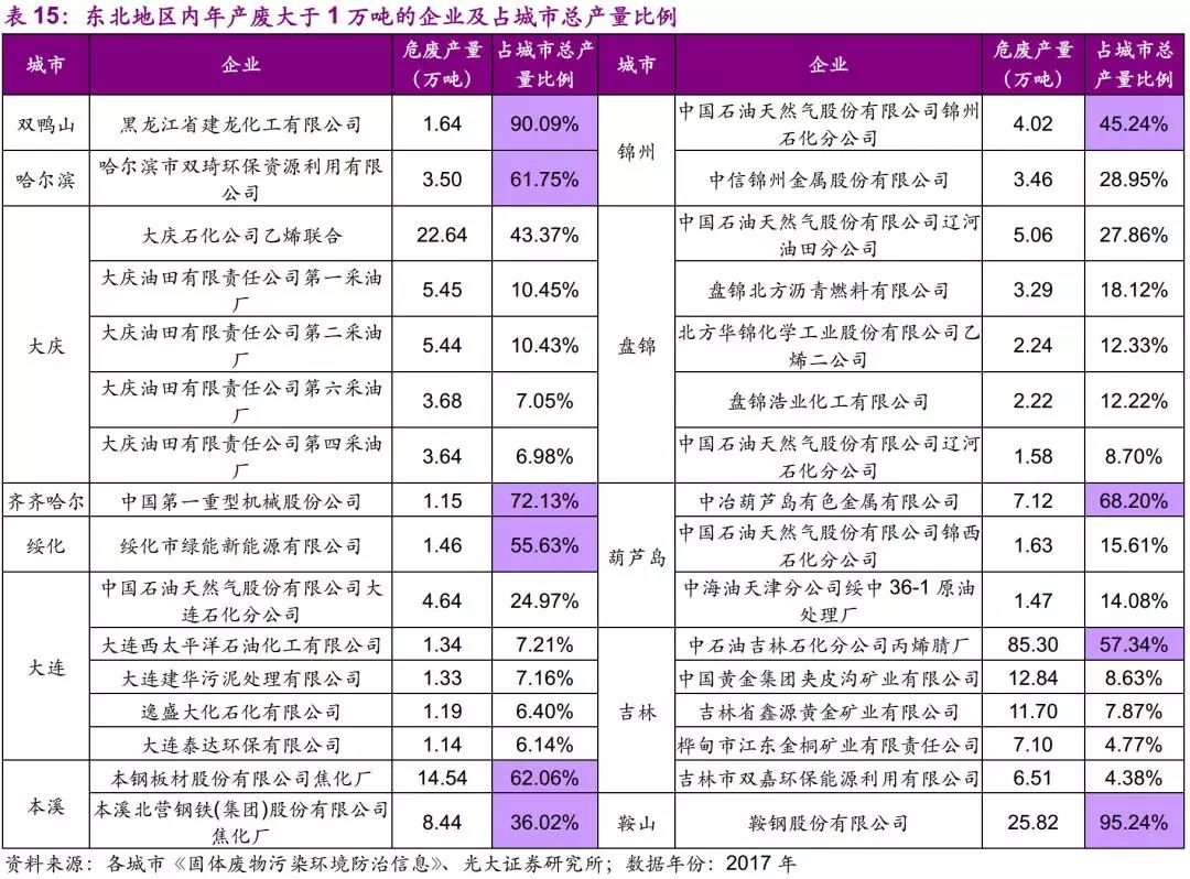 東北地區(qū)無(wú)均衡型城市,整體產(chǎn)業(yè)分為:1)石化、化工,如大連、阜新、盤(pán)錦、吉林、大慶等;2)煤、鋼產(chǎn)業(yè),如雞西、鞍山、雙鴨山、本溪、七臺(tái)河、伊春等。產(chǎn)廢量占所在城市產(chǎn)廢量比例較大的企業(yè)有:雙鴨山黑龍江省建龍化工有限公司(90%)、齊齊哈爾中國(guó)第一重型機(jī)械股份公司(72%)、鞍山鞍鋼股份有限公司(95%)、葫蘆島中冶葫蘆島有色金屬有限公司(68%)、吉林中石油吉林石化分公司丙烯腈廠(57%)等。