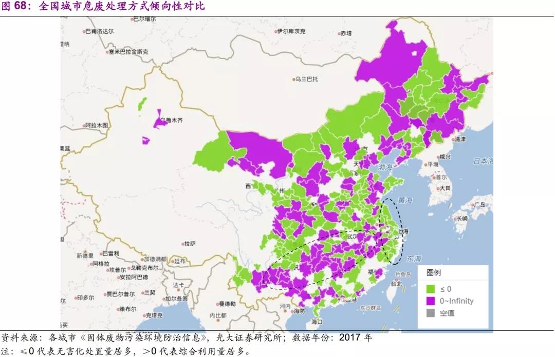 而東部沿海地區(qū),山東-江蘇-浙江一帶則以無(wú)害化處置為主。原因在于,該地區(qū)化工、制藥等行業(yè)發(fā)達(dá),危廢再利用程度低,一般依靠焚燒。