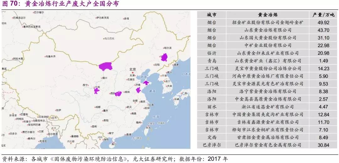 我國(guó)黃金冶煉行業(yè)產(chǎn)廢大戶(hù)主要分布于山東、河南、吉林三省,內(nèi)蒙古及甘肅亦有少量分布。其中山東省以煙臺(tái)為中心,煙臺(tái)市2017年工業(yè)危險(xiǎn)廢物產(chǎn)生量10萬(wàn)噸以上企業(yè)6家,其中五家為黃金冶煉行業(yè),分別為招金礦業(yè)股份有限公司金翅嶺金礦(50萬(wàn)噸)、山東黃金冶煉有限公司(44萬(wàn)噸)、山東國(guó)大黃金股份有限公司(31萬(wàn)噸)、中礦金業(yè)股份有限公司(23萬(wàn)噸)、山東恒邦冶煉股份有限公司(19萬(wàn)噸),主要危險(xiǎn)廢物為黃金冶煉氰化尾渣。