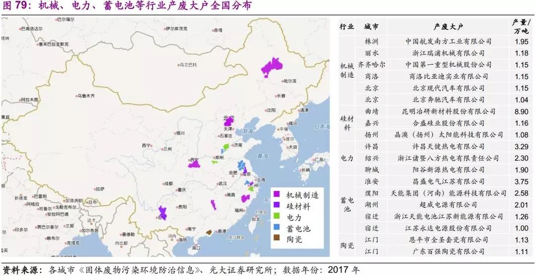 機(jī)械、電力、硅材料、蓄電池、陶瓷等細(xì)分行業(yè)分布較為廣泛。通常情況下,單廠危廢產(chǎn)量較小,進(jìn)入各市《固體廢物污染環(huán)境防治公告》的企業(yè)較少。而通過(guò)行業(yè)中體量較大的企業(yè),則可以推測(cè)出整體產(chǎn)廢水平。如機(jī)械行業(yè),齊齊哈爾中國(guó)第一重型機(jī)械股份公司2017年危廢產(chǎn)量1.2萬(wàn)噸;蓄電池行業(yè),湖州超威電源有限公司2017年產(chǎn)危廢2萬(wàn)噸。
