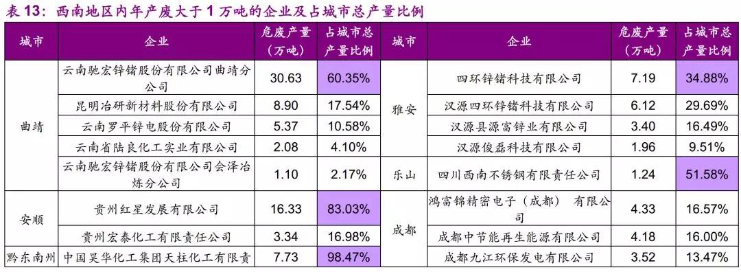 有色金屬冶煉大戶(hù)主要分布于西部地區(qū)。從湖南、貴州、廣西、云南、四川到陜西、甘肅、內(nèi)蒙古均有廣泛分布。其中產(chǎn)廢量較大的企業(yè)有株洲冶煉集團(tuán)股份有限公司(44萬(wàn)噸)、陜西鋅業(yè)有限公司商洛煉鋅廠(15萬(wàn)噸)、云南馳宏鋅鍺股份有限公司曲靖分公司(31萬(wàn)噸)、南丹縣南方有色金屬有限責(zé)任公司(52萬(wàn)噸)、漢中鋅業(yè)有限責(zé)任公司(19萬(wàn)噸)、貴州紅星發(fā)展有限公司(16萬(wàn)噸)。在雅安、安順、銅仁、曲靖等城市,有色金屬冶煉行業(yè)占據(jù)主導(dǎo)地位。