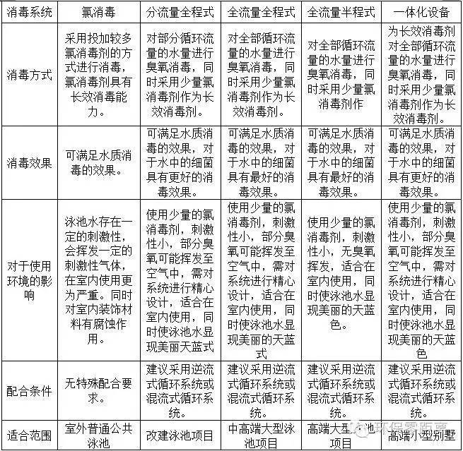 游泳池水處理系統(tǒng)的一個(gè)重要組成部分是消毒系統(tǒng),常用的消毒系統(tǒng)有氯消毒系統(tǒng)、臭氧消毒系統(tǒng)等。其中臭氧消毒系統(tǒng)從消毒量來(lái)分有全流量臭氧消毒系統(tǒng)和分流量臭氧消毒系統(tǒng)兩大系列;從消毒流程來(lái)分有全程式及半程式兩種;同時(shí),為了適應(yīng)新的發(fā)展,目前出現(xiàn)了一種一體化臭氧消毒設(shè)備。這些消毒系統(tǒng)的特點(diǎn)具體見(jiàn)下表: