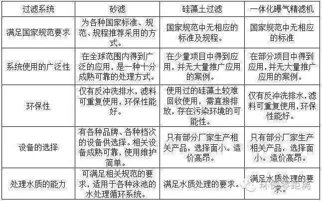 泳池過(guò)濾系統(tǒng)為循環(huán)處理系統(tǒng)的重要組成部分,該系統(tǒng)的選擇直接影響著游泳池水處理系統(tǒng)是否滿足使用要求。現(xiàn)在的過(guò)濾系統(tǒng)有砂濾、硅藻土過(guò)濾、一體化曝氣精濾機(jī)等,他們各有特點(diǎn),具體的分析見(jiàn)下表。