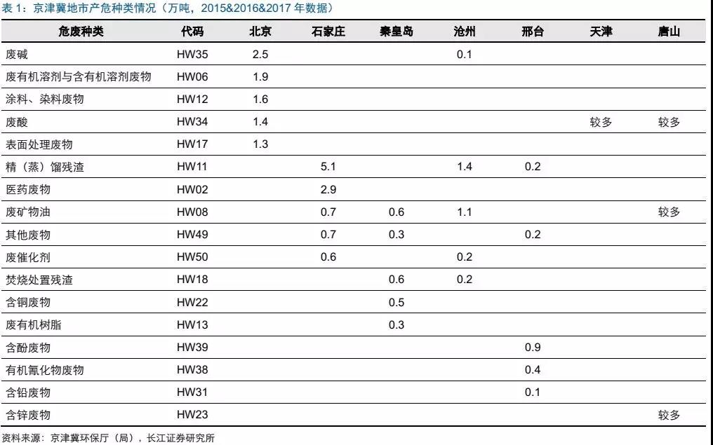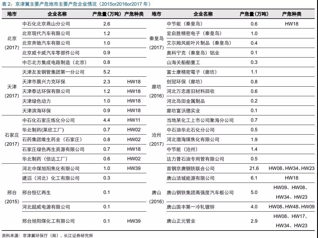 天津市:金屬制品(鋼管生產(chǎn)等)發(fā)達(dá),產(chǎn)生大量廢酸(HW34);另外,天津垃圾焚燒項(xiàng)目較多(泰達(dá)環(huán)保、綠色動力、濱海環(huán)保、晨興力克環(huán)保),產(chǎn)生大量的焚燒類殘?jiān)℉W18);