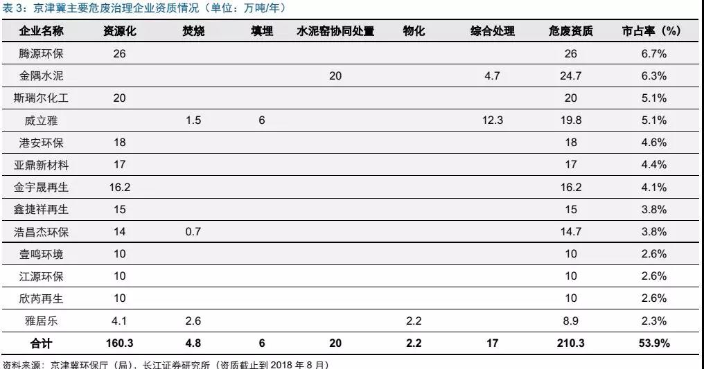 京津冀拿證企業(yè)中top10市占率達(dá)到46.5%,資質(zhì)規(guī)模前5大的企業(yè)(騰源環(huán)保、金隅環(huán)保、斯瑞爾化工、威立雅、港安環(huán)保)里2家(騰源環(huán)保、斯瑞爾化工)處理廢酸,1家處理廢鉛酸蓄電池(港安環(huán)保),1家水泥窯協(xié)同處置企業(yè)(金隅環(huán)保),1家外資綜合處置企業(yè)(威立雅);前幾大處置企業(yè)如下: