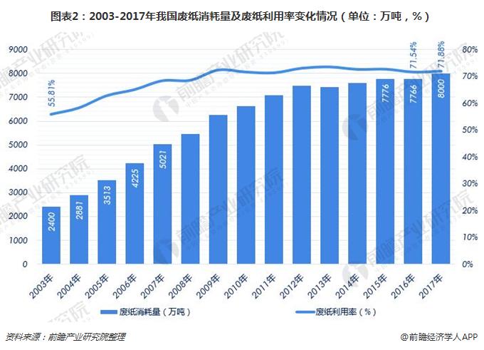 前瞻產(chǎn)業(yè)研究院長期監(jiān)測數(shù)據(jù)顯示,廢紙漿是我國最大的造紙生產(chǎn)原料,2017年廢紙漿消費量占比達(dá)到了62.7%。近年來我國廢紙消耗量逐年上升,從2003年的2400萬噸上升至2017年的8000萬噸左右,廢紙的利用率也從2003年的55.81%進(jìn)一步提升至71.88%。