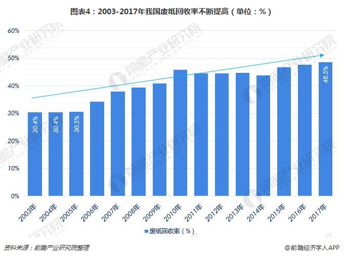 我國的廢紙回收率也從2003年的30.4%提升至了2017年的48.5%,上升了18.1個百分點。雖然我國廢紙回收率不斷提高,但與發(fā)達(dá)國家仍存在較大差距。據(jù)統(tǒng)計,目前發(fā)達(dá)國家的廢紙回收率高達(dá)80%,甚至有些國家可以達(dá)到100%。國內(nèi)廢紙回收率與國外廢紙回收的差距,也正是造成我國廢紙長期依賴進(jìn)口的主要原因之一。