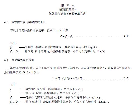 若有三根以上的近距排氣筒,且排放同一種污染物,應(yīng)以前兩根的等效排氣筒,依次與第三、第四根排氣筒取等效值。等效排氣筒的有關(guān)參數(shù)按附錄A 規(guī)定計算。