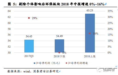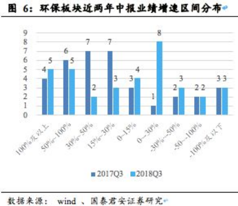我們將該披露三季度業(yè)績(jī)情況的上市公司按照細(xì)分行業(yè)劃分,得到固廢、環(huán)境監(jiān)測(cè)、危廢、清潔能源、水處理(碧水源使用扣非利潤(rùn))、煙氣治理的增速區(qū)間分別為27%~40%、14%~28%、7%~15%、-34%~-26%、-35%~-17%、-70%~-38%。若將單個(gè)公司對(duì)整體板塊業(yè)績(jī)影響較大的三聚環(huán)保、天翔環(huán)境、科融環(huán)境影響剔除后,得到固廢、環(huán)境監(jiān)測(cè)、危廢、清潔能源、水處理(碧水源使用扣非利潤(rùn))、煙氣治理的增速區(qū)間分別為27%~40%、14%~28%、7%~15%、3%~8%、-17%~2%、-28%~4%。