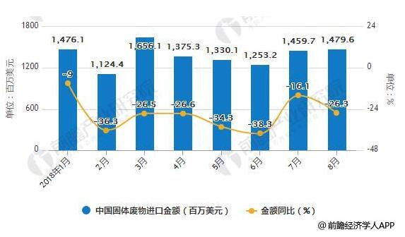 在進(jìn)口金額方面,2018年3-6月中國(guó)固體廢物進(jìn)口金額呈下降趨勢(shì),2018年6月中國(guó)固體廢物進(jìn)口金額為1253百萬(wàn)美元,同比下降38.3%。2018年7-8月中國(guó)固體廢物進(jìn)口金額有所回升,2018年8月中國(guó)固體廢物進(jìn)口金額為1480百萬(wàn)美元,同比下降26.3%。