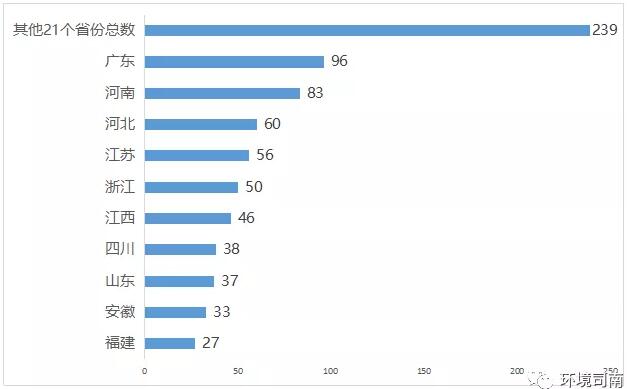 容易出環(huán)衛(wèi)大項(xiàng)目的10個(gè)省份中,廣東、江蘇、浙江、山東、四川等五個(gè)省為傳統(tǒng)環(huán)衛(wèi)大省,河南、河北、福建、江西、安徽等五個(gè)省為新興環(huán)衛(wèi)大省。